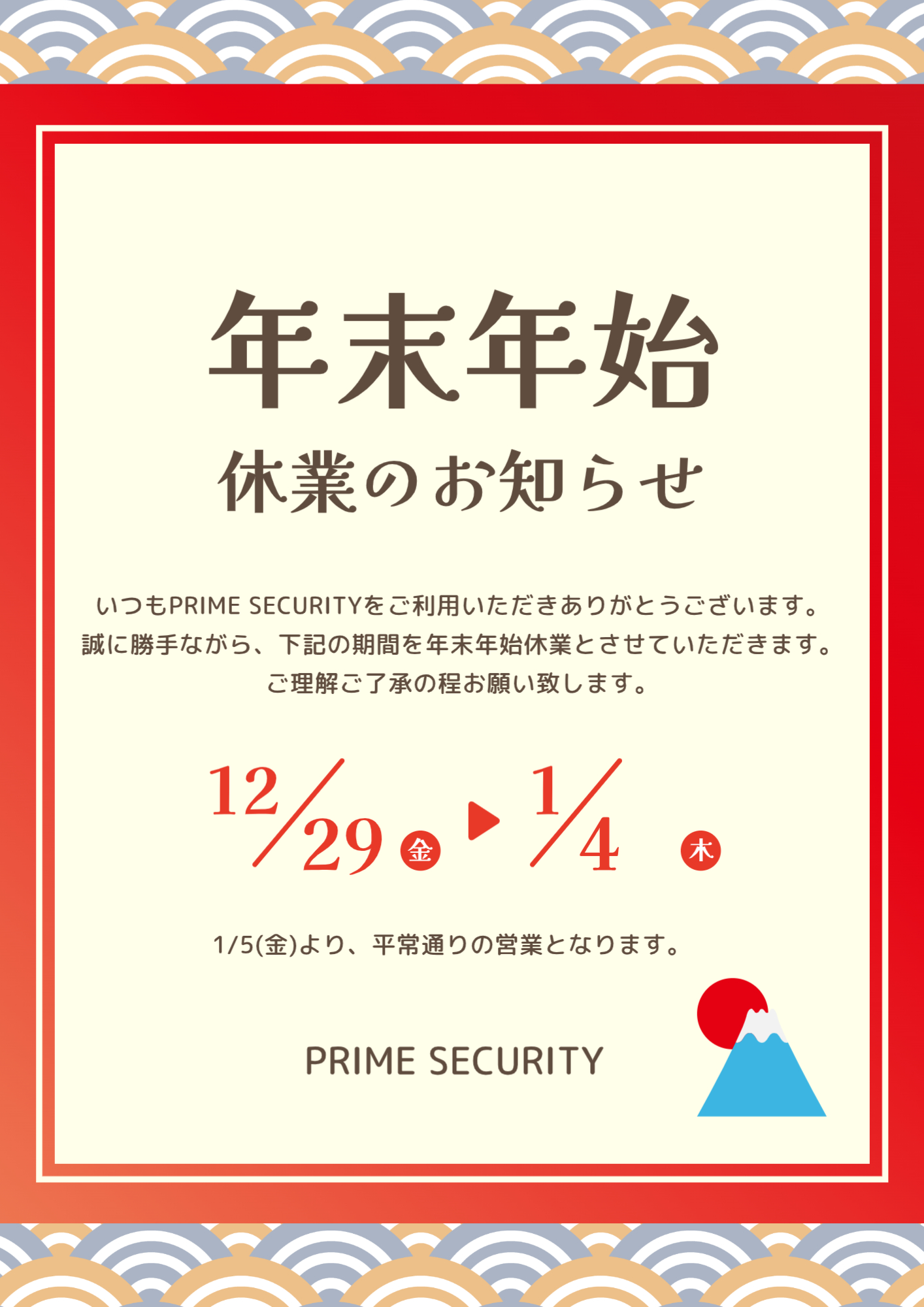 NEWS 2023.12.5 年末年始のお知らせ 平素は格別のお引き立てをいただき厚くお礼申し上げます。 弊社では、誠に勝手ながら下記日程を年末年始休業日とさせていただきます。 ■年末年始休業期間2023年12月29日(金) ~ 1月4日(木) ご不便をおかけいたしますが、何卒ご了承いただきますようお願い申し上げます。 尚、1月5日より、通常営業とさせていただきます。 一覧へ戻る 一覧へ戻る